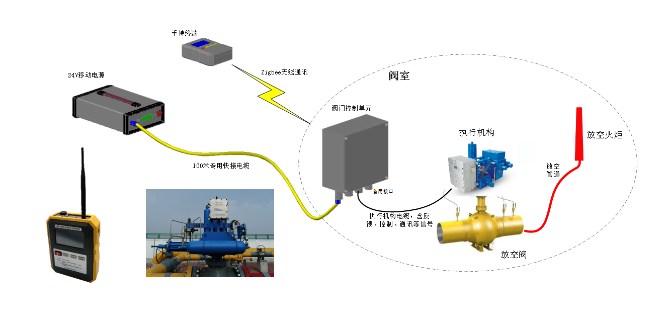 阀室放空远程操作控制系统,主要应用于长输管道阀室,提供安全的阀室放空操作。通过对阀室放空阀进行远程操作,既能够实时观察现场情况又能够保证安全距离;通过有线/无线连接以及阀室供电/移动电源等不同方案的搭配,有效协助用户安全作业。