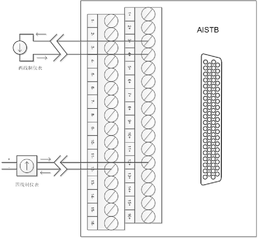 AISTB具备3个接口,一个为50针的D型接头DB50,用于通过50芯的预制电缆与AI模块相连;一个为接线端子,共32点,其中16点与现场侧8个通道开关量相连;一个为4针的冗余现场侧电源输入接口。AISTB的接线端子定义,如下图所示